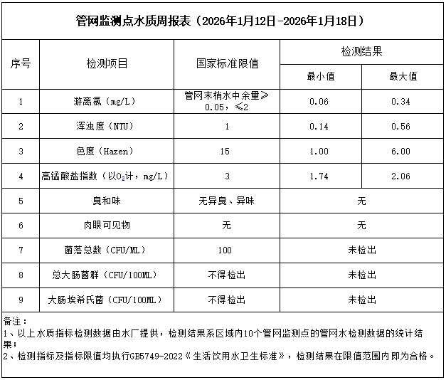 管網(wǎng)監(jiān)測(cè)點(diǎn)水質(zhì)周報(bào)表(2026年1月12日-2026年1月18日)