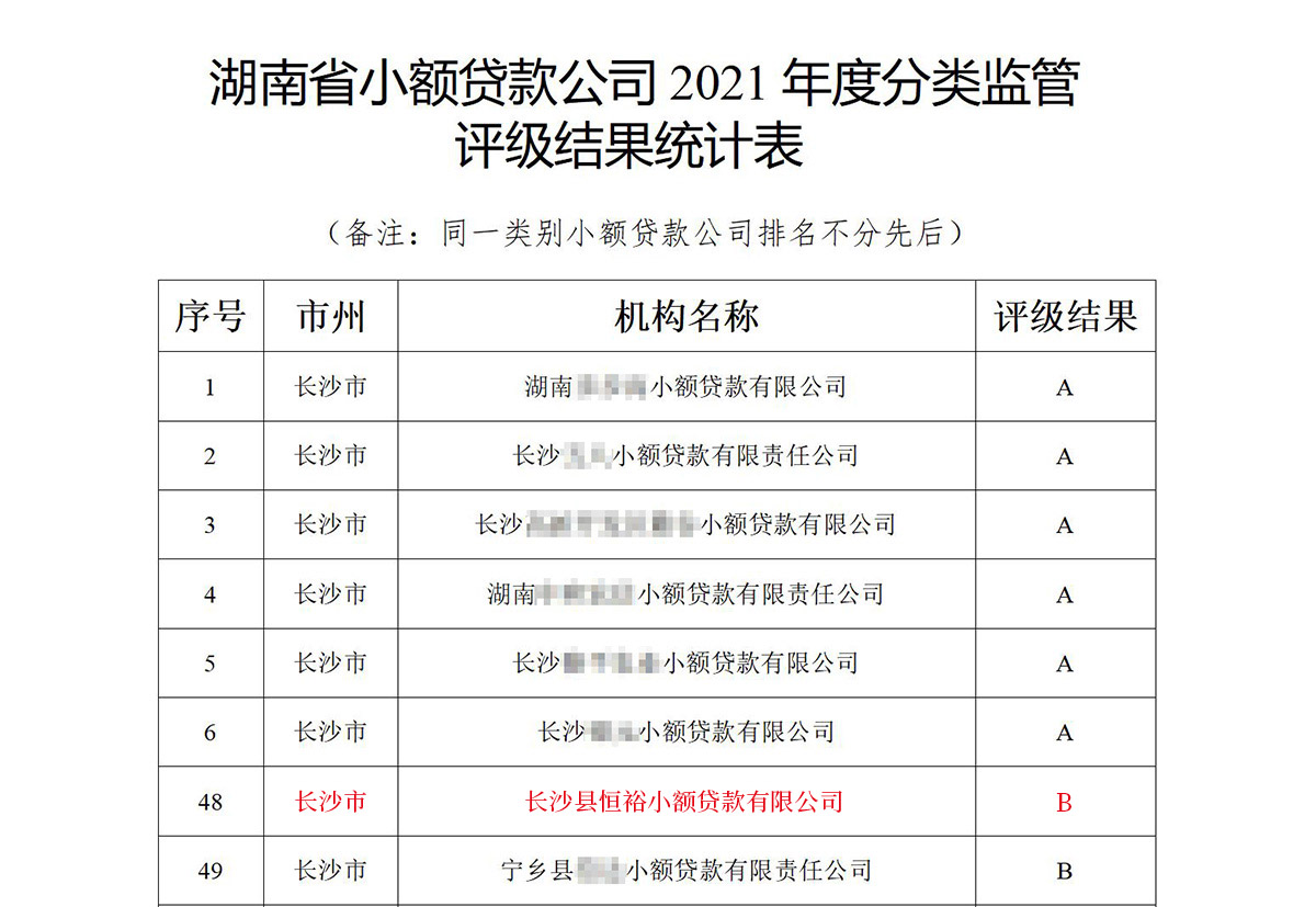 長沙縣恒裕小額貸款股份有限公司于2021年3月15日設(shè)立,經(jīng)營范圍主要為家電批發(fā)零售流動貸款;國家政策允許的農(nóng)村家電消費(fèi)貸款;“三農(nóng)”和中小企業(yè)需求的金融業(yè)務(wù);為中小企業(yè)發(fā)展、管理、財(cái)務(wù)等咨詢業(yè)務(wù)及其他經(jīng)批準(zhǔn)的業(yè)務(wù)。多年來,一直被湖南省金融辦監(jiān)管評級為B級資質(zhì)單位。