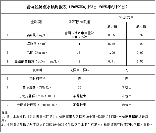 管網(wǎng)監(jiān)測點(diǎn)水質(zhì)周報(bào)表(2025年6月23日-2025年6月29日)