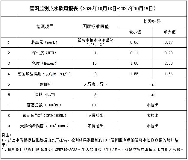 管網(wǎng)監(jiān)測(cè)點(diǎn)水質(zhì)周報(bào)表(2025年10月13日-2025年10月19日)