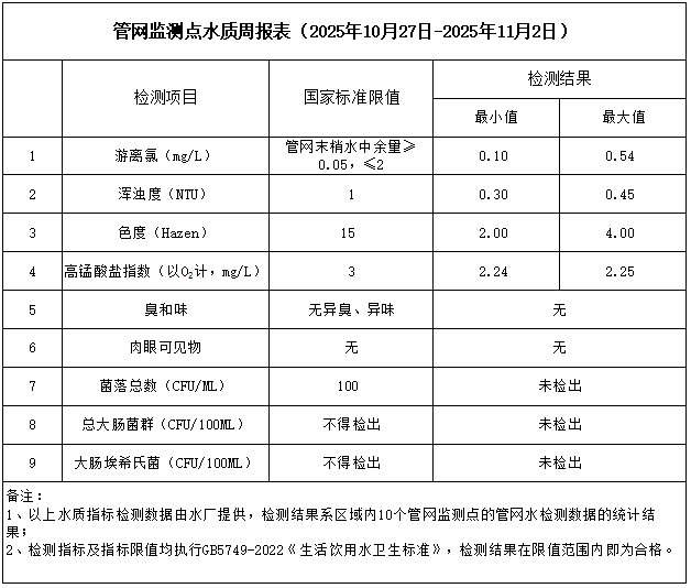 管網(wǎng)監(jiān)測點水質周報表(2025年10月27日-2025年11月2日)