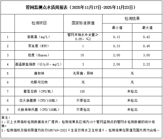 管網(wǎng)監(jiān)測(cè)點(diǎn)水質(zhì)周報(bào)表(2025年11月17日-2025年11月23日)