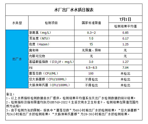 水廠出廠水水質(zhì)日?qǐng)?bào)表(2023-7-1)