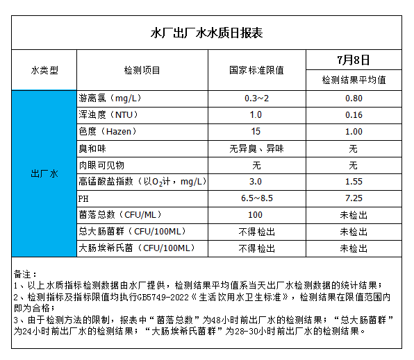 水廠出廠水水質(zhì)日?qǐng)?bào)表(2023-7-8)