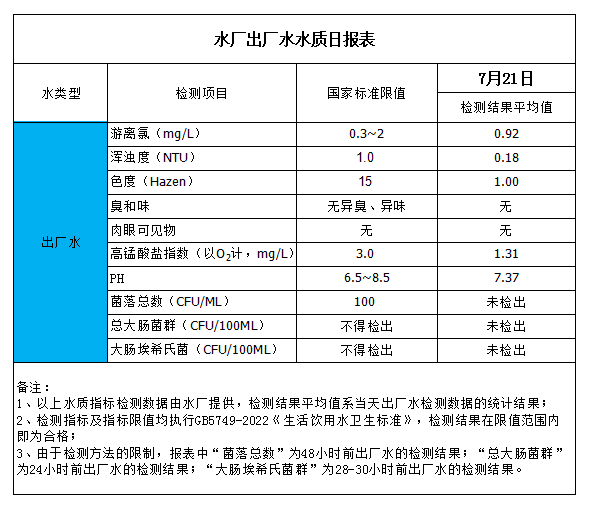 水廠出廠水水質(zhì)日報表(2023-7-21)