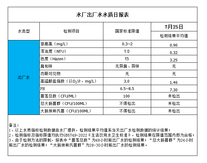 水廠出廠水水質(zhì)日?qǐng)?bào)表(2023-7-25)