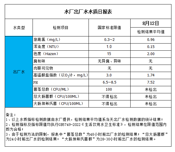 水廠出廠水水質(zhì)日報(bào)表(2023-8-12)