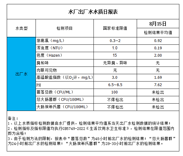 水廠出廠水水質(zhì)日報表(2023-8-15)