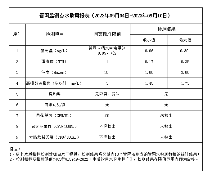 管網(wǎng)監(jiān)測點水質(zhì)周報表(2023年09月04日-2023年09月10日)