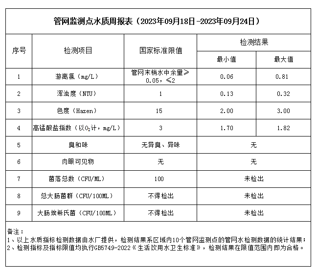 管網(wǎng)監(jiān)測點(diǎn)水質(zhì)周報表(2023年09月18日-2023年09月24日)
