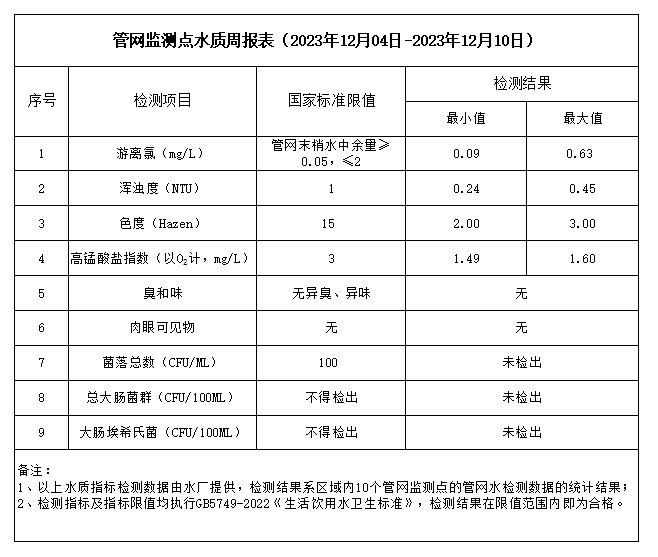管網(wǎng)監(jiān)測點水質(zhì)周報表(2023年12月04日-2023年12月10日)