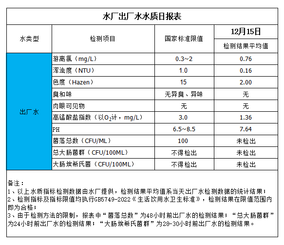 水廠出廠水水質(zhì)日?qǐng)?bào)表(2023-12-15)