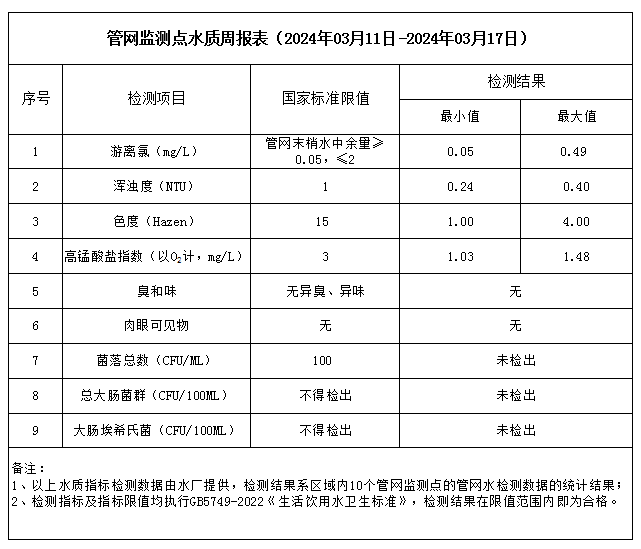 管網(wǎng)監(jiān)測點(diǎn)水質(zhì)周報(bào)表(2024年03月11日-2024年03月17日)