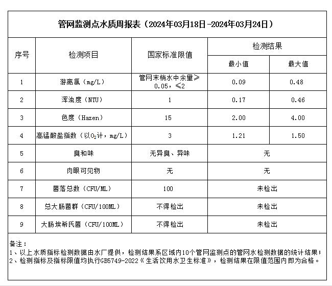 管網(wǎng)監(jiān)測點水質(zhì)周報表(2024年03月25日-2024年03月31日)