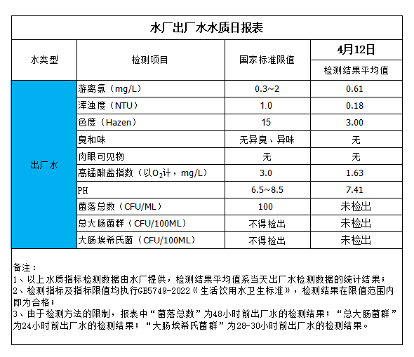 水廠出廠水水質日報表(2024-4-12)