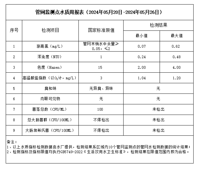 管網(wǎng)監(jiān)測點水質(zhì)周報表(2024年05月20日-2024年05月26日)