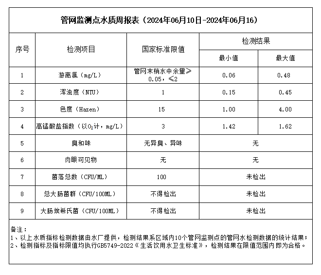 管網(wǎng)監(jiān)測點水質(zhì)周報表(2024年06月10日-2024年06月16)