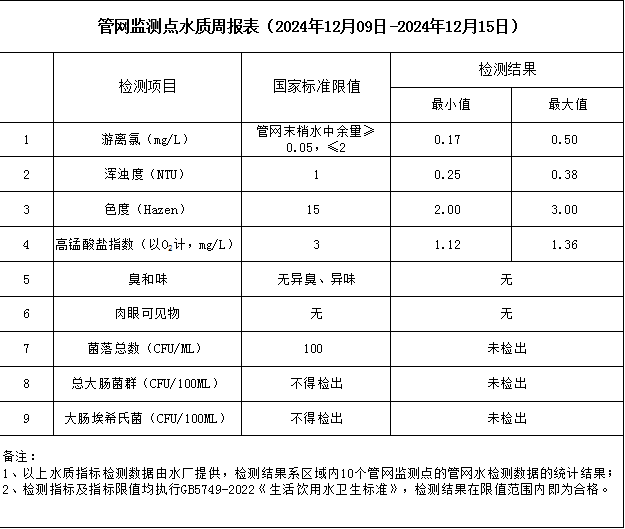 管網(wǎng)監(jiān)測點(diǎn)水質(zhì)周報表(2024年12月9日-2024年12月15日)