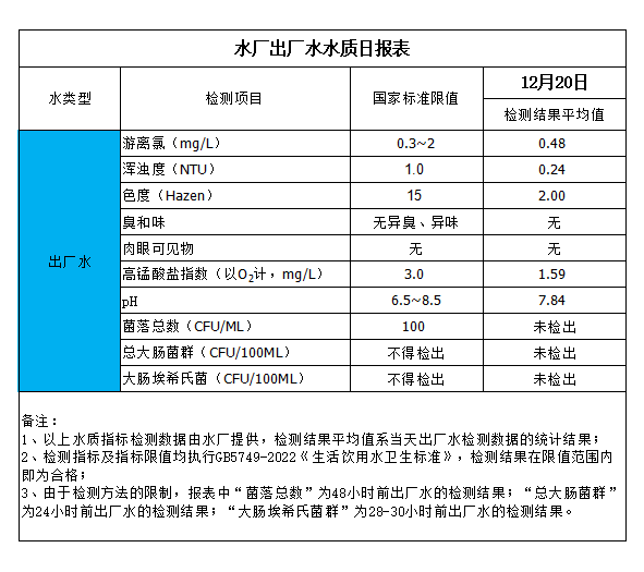 水廠出廠水水質(zhì)日?qǐng)?bào)表(2024-12-20)